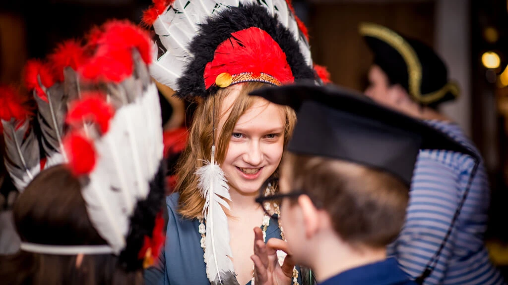 Игра начинается с преображения. Ведущий раздаёт тематический реквизит и элементы костюмов. Короны и мантии, венцы, викингские топоры, загадочные амулеты — все это мы припасли для игроков «Ночи в Музее».